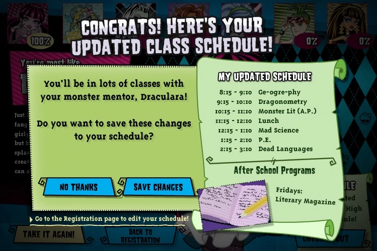 Inscription est un jeu de type quiz pour décider à quel élève de Monster High l'utilisateur ressemble le plus. Il a été publié sur le site Web de Monster High le 12 juillet 2010. Seuls sept personnages sont disponibles comme résultat potentiel. Une fois le quiz terminé, le personnage auquel l'utilisateur ressemble le plus reçoit une brève description et son emplois du temps de cours peut être examiné.