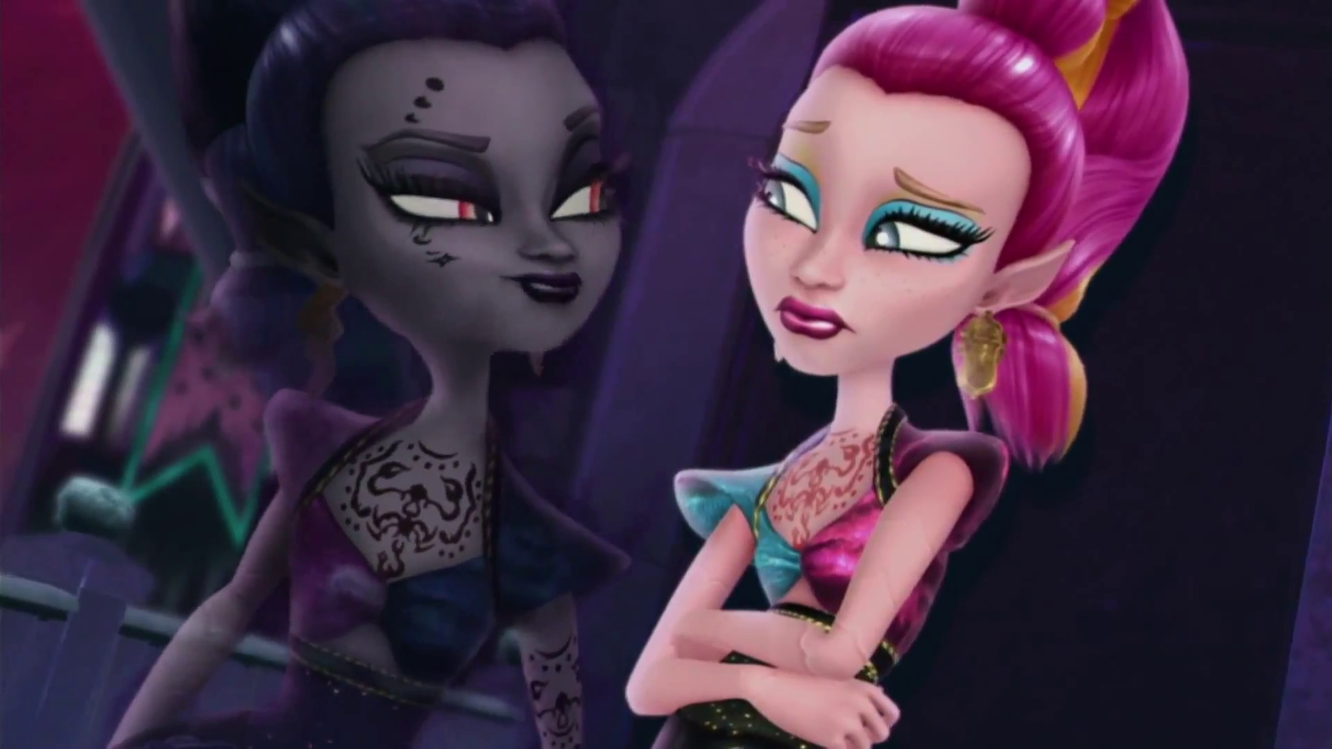 A thousand years later to the present, Monster High welcomes back the students for the new scaremester. Everyone talks about the upcoming events for the year such as the upcoming occultation (eclipse) while expressing what they wish would happen throughout the new school year. Howleen Wolf, who no longer wants to be an outcast, plans to take more action as so far as to arrange her name in lights while her shadow friend, Twyla Boogeyman, protests against it. Frankie Stein, Clawdeen Wolf, Lagoona Blue, Draculaura and Ghoulia Yelps spot Howleen and attempt to stop her, however they are too late and are later punished to clean the school attic by Headless Headmistress Bloodgood. Howleen apologizes as they clean while Clawdeen tries to understand her little sister’s reasoning but is dismissed by Howleen quickly. As she moves away and cleans more of the attic, Howleen unknowingly eventually finds the lantern and releases Gigi. The pink genie introduces herself and explains that Howleen is her new finder and is granted thirteen wishes. Howleen uses her first wish to wish the ghouls and herself out of detention. As Gigi grants the wish, they disappear in a flash of light and unintentionally free Whisp. The shadow genie sees the opportunity of another eclipse and follows the ghouls unseen.