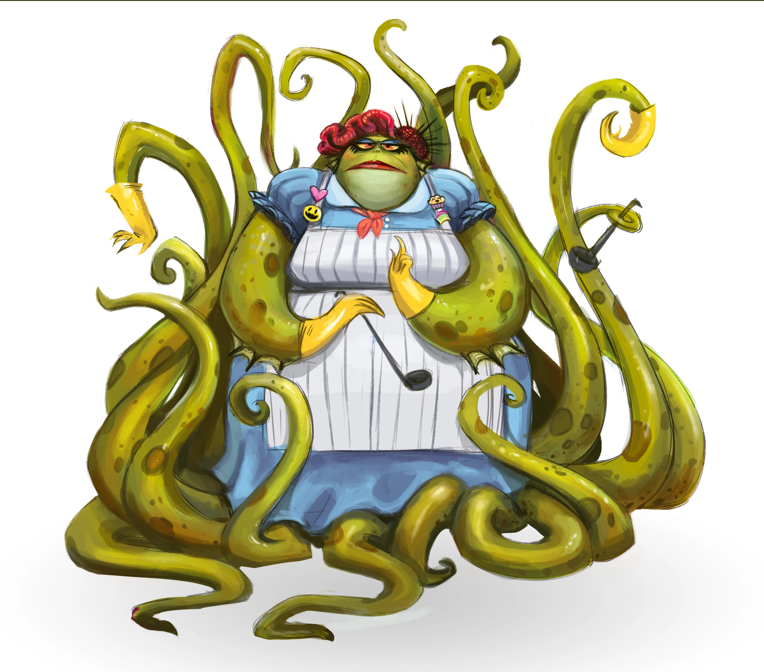 The lunch lady is a large, yellowish-green, aquatic monster with thirteen tentacles, not counting her arms. Her stature and multiple limbs make it so that she doesn't move around as much as most people because she can reach things easier with her tentacles. Her eyes are yellow and covered by a monobrow, while her hair is red and, when tucked away in a hairnet, held together with pins on the left in such a way that the look reminds of a sea urchin.