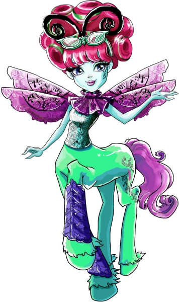 Caprice has deep fuchsia hair in curls with green curls on the top of her head. She wears bug-like sunglasses and has black antenna. She has dragon fly like wings on her back with black music notes on them. Being half centaur she has a horse lower body, with music note tattoos on her flank.
