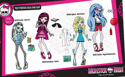 The Classroom assortment consists of two sets of characters dressed up for a specific class, of which the first features Lagoona Blue at Mad Science, Frankie Stein at Home Ick, and Ghoulia Yelps at Physical Deaducation. The three dolls of the set were released in Mid July, 2011 and re-released with fewer accessories as Walmart exclusives in Early October, 2012. The second set consists of two 2-packs: one features Abbey Bominable and Heath Burns as attending Home Ick, the other features Cleo de Nile and Ghoulia Yelps as attending Mad Science.
