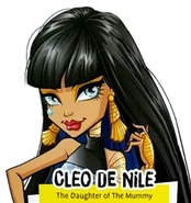 Cleo is an Egyptian princess who was discovered inside a tomb in Cairo, Egypt. She agreed to join Monster High after making friends with the other main characters. While she is vain, spoiled, lazy, and a diva, she has a heart of gold deep down and is extremely loyal to her loved ones. She is also highly intelligent. Though in generation 2 Cleo is a bit more of a snob, and loves the finer thing more, and is even more other the top about it then in the original.