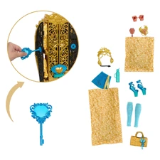Unlock the secrets behind the gates of Monster High with this Skulltimate Secrets: Monster Mysteries closet set! It comes with Cleo De Nile doll as well as regally chic clothes and accessories. Cleo De Nile has a show to put on, but she is nowhere to be found! Search for clues to discover her location along with 19+ surprises in 3 scary-fun steps: solve, unlock, reveal. Step one? Use the magnifying glass key to reveal symbols on the treasure map. Once kids unlock the closet doors they will find charms that match the map's symbols, hidden in the surprises!