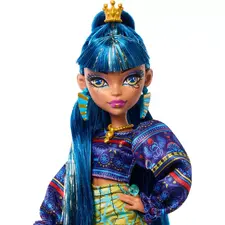 - Cleo De Nile™ doll wears a royally cool fashion featuring a blue and golden dress with mummy wrap-inspired sleeves and a scary-chic chain belt.