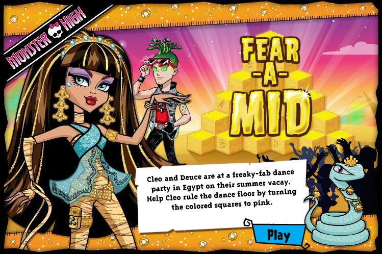 Fear-A-Mid is a game released on the Monster High website on August 10, 2011. It casts Cleo de Nile as its protagonist, who seeks to show her moves on the dance floor while on a date with Deuce Gorgon in Egypt. The game has been taken of the website for unknown reason.