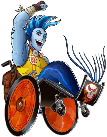 Accessories: Finnegan comes with clear goggles and a functioning black wheelchair with many orange accents to it. There is a brown backpack hung onto it, fiery details in the wheels, and silver armrests.