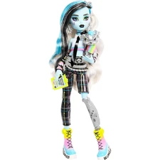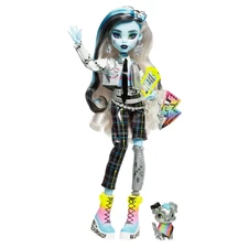 School is back in session, and the Monster High ghouls are showing up in scream-tastic style! Frankie Stein doll struts down the Monster High hallways in an electrifying fashion featuring a plaid skirt, lightning bolt-printed blouse and stitch-detailed vest. Their freaky-fabulous look is complete with chunky platform sneakers, creeperific accessories and a prosthetic leg and stitch details celebrating their unique style. Take Frankie Stein doll’s look to the next level with a voltageous varsity jacket and electrifying accessories. Plus, inspire spooktacular storytelling with their creepy-cute pet dog, Watzie! Doll cannot stand alone. Colors and decorations may vary.