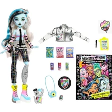 As leader of the Welcome Committee at Monster High, Frankie Stein doll makes the new ghouls in school feel fright at home! This faboolous set comes with an electrifyingly colorful Frankie Stein doll, as well as 15 storytelling accessories -- including Watzit the dog and a life-size poster. It makes a creeperific gift for kids ages 3 years old and up! Fully articulated. Doll cannot stand alone. Colors and decorations may vary.