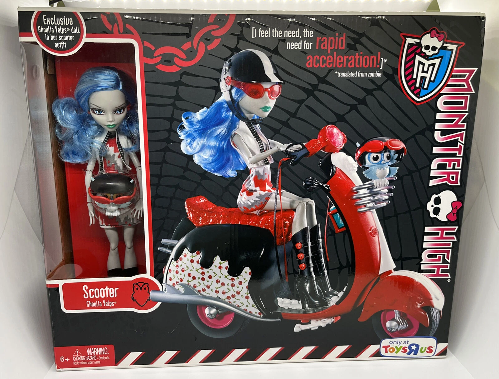 - Ghoulia Yelps wears her classic white glasses with a black and red brain hairband and red earrings that are squares with elements on them from the periodic table. Her make up is light blue with red lipstick. Her hair goes down to her mid waist and her bangs are gelled to the side. She wears a white lab coat with red brain trim on the collar and ends of the sleeves. Her dress is black with short sleeves and a design that is elements from the periodic table arranged in such a way that they spell out words such as "monster high", "lab" and "brains" among others. The dress's neckline has red trim with a small red bow in the center. Her shoes are white converse wedges with a white Ghoulia skullette where the converse logo should be, and has blue laces with the wedge part being red with a brain design on it. The toes of the shoe are black. She is also wearing two thin bracelets, one red, and one black. The accessories are four test tubes, one container, and a gold piece of tubing shaped like a skullette. The two pack comes with two stands, one brush, and one shared journal.