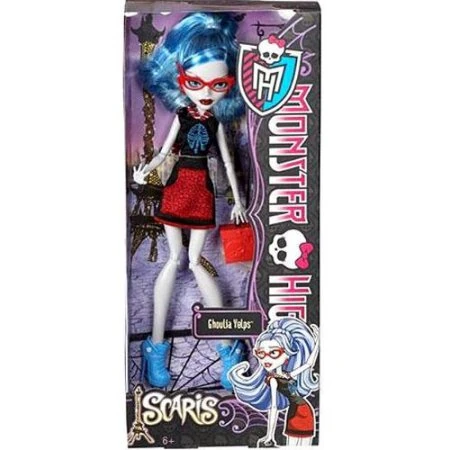 - Her outfit consists of a blue shimmery pencil dress, a red collar, black pouf sleeves with red trim, white braces and a black two-layer skirt, printed with stencils of white and red glasses, with red belt trim. Ghoulia accessorizes with a red hairband, red eyeball earrings, and a red brain-shaped purse. Her glasses are of the familiar horn-rimmed type, this time in red. Her shoes have thick red brain soles while white bone body and crossbones on the front. Her hair is in bangs, and is tied in a short top ponytail. The doll comes with a red touch-screen style iCoffin.