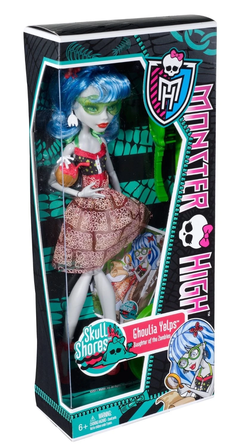 - Ghoulia wears a black button-down swimsuit with green dots, a red collar and green straps, a red and white skirt with a brain pattern, and transparent red goo heeled sandals. Her accessories include a red hairclip made up of small brains that form a flower, green sunglasses, and a pair of mismatched earrings, one a red brain with teeth marks on it and the other a tiny white pair of lungs. The doll includes a coconut cup with a brain smoothie and small bone cocktail umbrella, a green brush and a map of Skull Shores. Ghoulia's hair is short and curly.