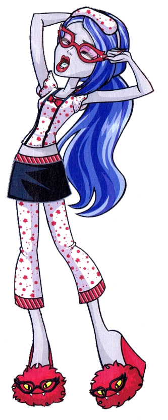 - Ghoulia wears a white shirt with "blood splatter" polka dots and matching pants, and a black miniskirt held by suspenders. She wears red cat-eye glasses and red slippers with a monster's face on them, which also have glasses. She has her hair tied back into a ponytail and she has pink eyeshadow. She comes with a bag of what looks like red popcorn, but is labeled "Brain Puffs". She also wears a sleep mask that matches her "blood spatter" pajamas.