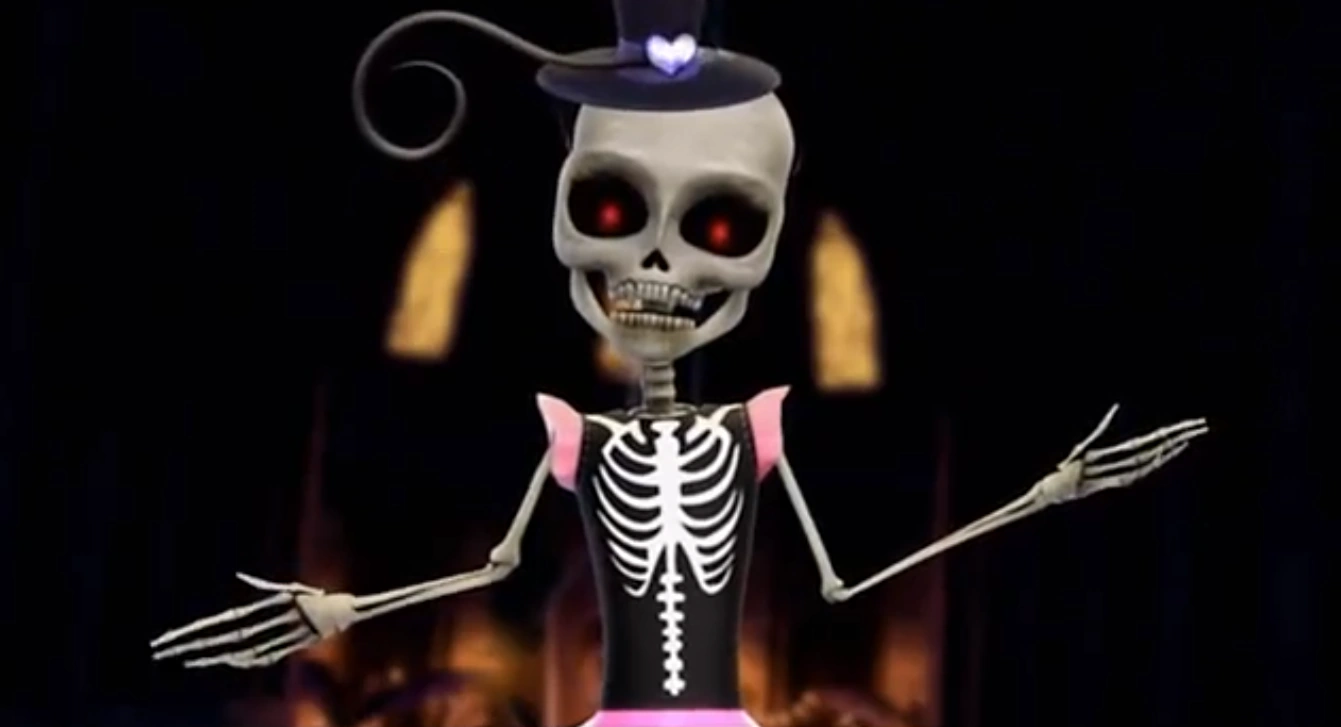 The Hall of Halloween Skeleton is, presumably, a non-living robot in the shape of a skeleton. She is the automated keeper of Hall of Halloween, a location in the catacombs where the true origins of Halloween are kept. She runs on electricity, meaning her mechanism can't be older than some 200 years, and she moves around with her back attached to a large mechanical arm.