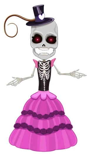 The Hall of Halloween Skeleton wears a black mini-top hat with a purple band around it. It is decorated with a purple heart and a black swirl. Her dress is sleeveless with pink trim around the shoulders. The top part is black and displays a white spine and ribcage, along which six pink buttons are placed. The lower part of her dress is a four-layered pink shirt, of which the second and third layers sport black lace as trim. She does not wear shoes.