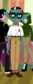 He is a small, green creature with black hair and glasses. He usually wears a white shirt, light brown pants, and a red bow tie.
