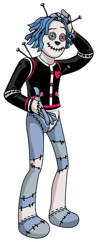 Hoodude Voodoo is a 2011-introduced and all-around character. He is a human-sized living voodoo doll, created by Frankie Stein to be her emergency boyfriend. She realized soon after she wasn't ready for a relationship yet and broke it off, leaving Hoodude in despair because being with Frankie was his life's purpose. After a long time, he picked himself up and found other things to enjoy about life. Romance itself still is one of his favorite topics, but a good sappy movie can accommodate that. Hoodude is the kind of person that is always willing to help and almost always looks at the bright side, to the point of hopeless naivety. He currently lives at Kindergrübber's.