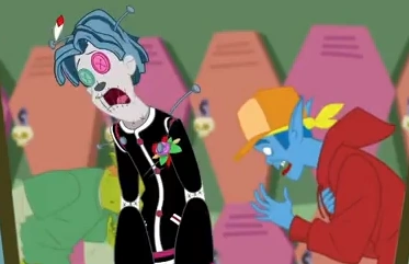 Hoodude is good friends with Scarah Screams, who has a locker near his. Scarah likes Hoodude because he is a good listener, and Hoodude, being a sensitive soul, just appreciates all positive attention he gets.