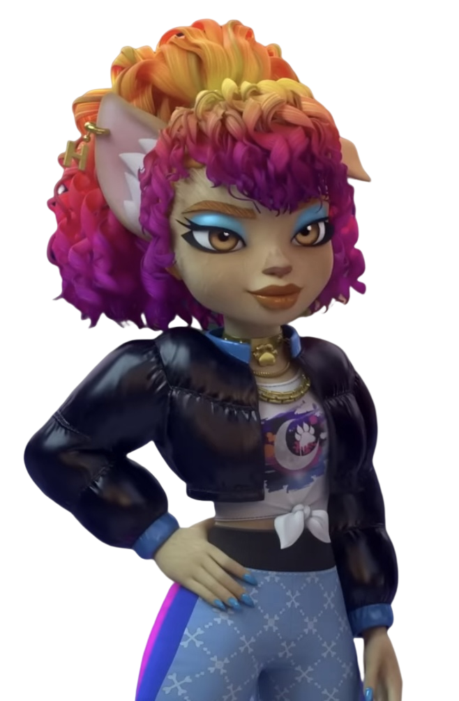 Her eyebrows are colored in a darker shade of her fur, and her eyes are a pale-golden in color with thick eyelashes protruding each. She also sport a brown nose, sharp fangs inside of her mouth, and makeup which consists of shimmering-blue eyeshadow, golden-brown lip gloss, and blue nail polish on her sharp claws. She is shown to be a few centimeters shorter than Clawdeen.