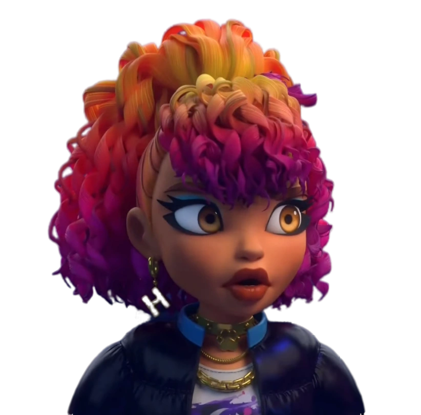 Howleen is a slim, cream-furred teenage werewolf with extra tufts on her body. She has long curly hair which has been dyed into a gradient of yellow, orange, pink and magenta (somewhat resembling a sunset), kept in a high-ponytail with bangs (in the artwork, her ponytail is held by a golden hair tie). Her hair reveals her rather large ears with the left flopped down and the right sporting a small, golden hoop-earring with an "H" pendant.