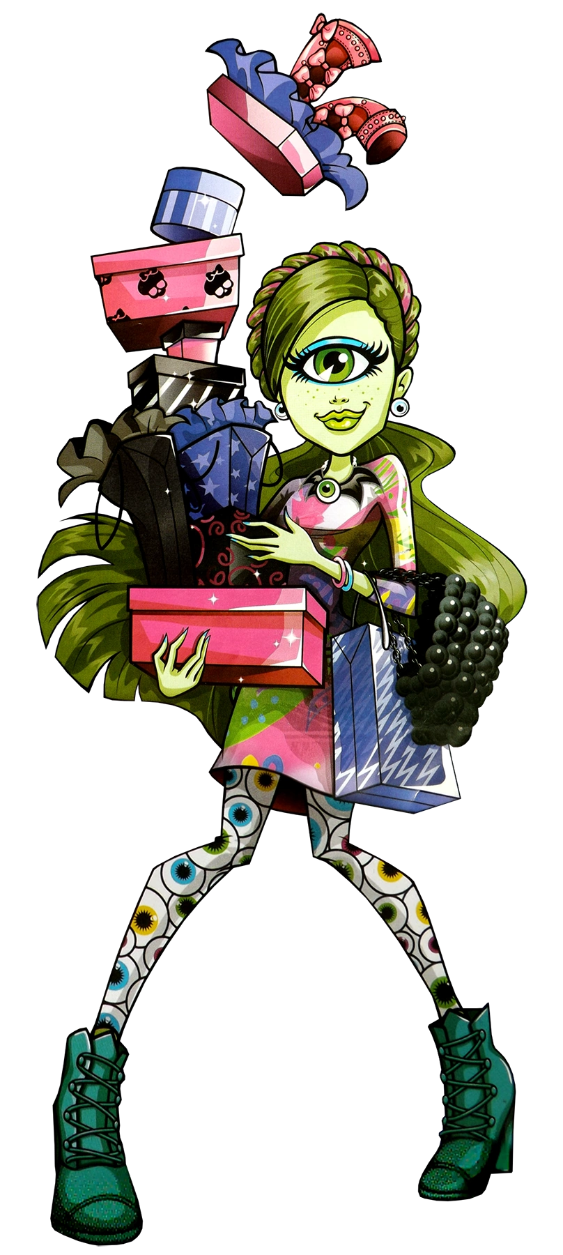 Accessories: She also comes with a wide range of accessories. Featuring in her main outfit she has a pair of eyeball earrings, a chain necklace with a winged eyeball charm, 4 bangles in pink, blue, yellow and green, a green rope belt, a black purse with molded eyeballs and a pair of blue heeled sneakers with an open eye printed on the left shoe and a closed eye on the right one, as if blinking. The extra accessories are: a big teal belt with an eye-looking buckle, a blue choker, an orange and pink pair of bracelets, a black recast version of her Mary Janes worn on the SDCC release and a pair of Hot pink gladiator style boots with studded and bow collared top and eyeball bows down the front that lead to a black stud trimmed heel.