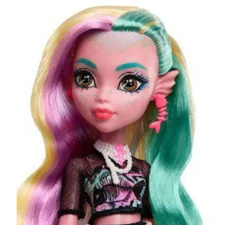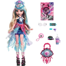 School is back in session, and the Monster High ghouls are showing up in scream-tastic style! Lagoona Blue doll struts down the Monster High hallways in a fin-tastic fashion featuring a hot-pink hoodie with mesh sleeves and a trendy, tie-dye bike shorts romper. Her gore-geous look is complete with a sea monster-inspired waist bag, seashell backpack, colorblock platform sandals and freaky-fabulous fin details inspired by her unique scaritage. Switch up Lagoona Blue doll's look with a 'metallic,' fish scale-detailed swimsuit, and inspire spooktacular storytelling with fearsome accessories and her creepy-cute pet fish, Neptuna! Doll cannot stand alone. Colors and decorations may vary.