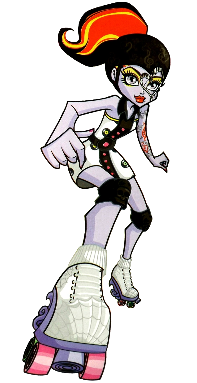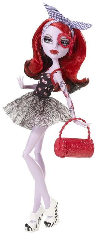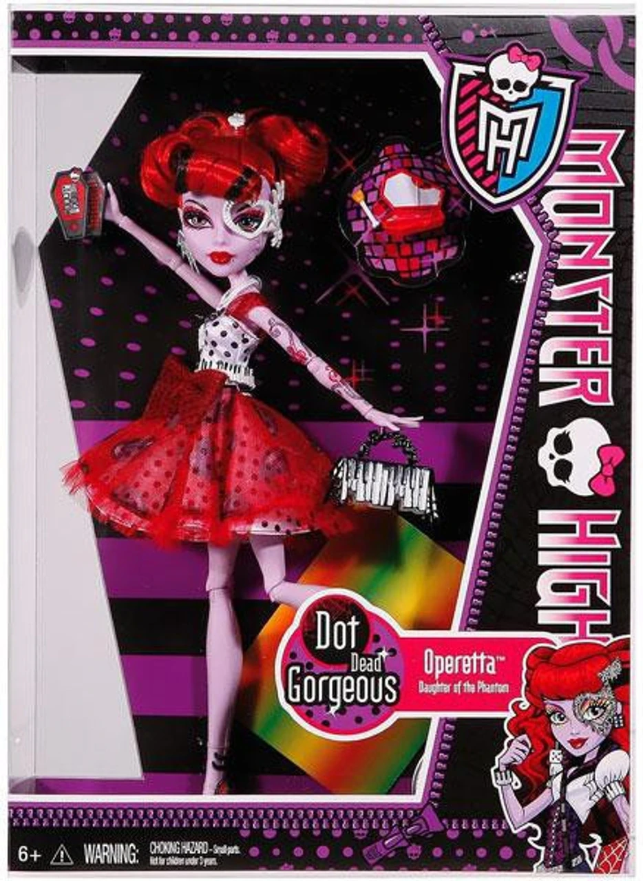 Operetta wears a white full-skirted sheath dress with black polka dots, and the skirt has another layer made of chiffon fabric that is red and has a black disc pattern on it and has wide red straps with black polka dots. She also wears a belt that has a piano design, and her shoes are red and black wedges with dice on the straps and spiders clinging to the backs. Her accessories include a layered pearl necklace with three black music note charms hanging from it as well as a white spiderweb charm in the middle, an earring that is supposed to be a silver spiderweb, her signature white heart-shaped mask only this time part of it is in the form of a spiderweb and is connected to another earring that is a white bow with a pearl in the middle, a red iCoffin, a red coffin-shaped make-up pallet, and a piano-patterned purse. The doll comes with a silver brush, a silver stand, and a picture. Her bangs are rolled up, and the rest of her hair is curled and held back with a red bow covered with black dots and has a skullette in the middle. One of her arms is clean, while the other is tattooed with purple and red swirls and two red treble clefs as always. Her lips are deep red, and she keeps her smoky eyes.