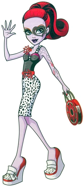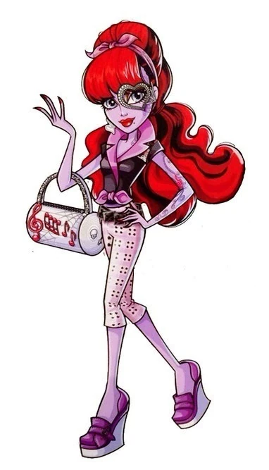 - Operetta’s fashion pack consists of a top, a skirt, a belt, a red and black bag with a red spiderweb on the front, shoes, and red spiderweb detailing. The top is black with purple lace detail and short stripy black and white straps. A long white skirt with black music notes is worn with the top. There is a red spiderweb on her right strap; two others form a sort of belt. Operetta’s shoes have a mix between the music note detail and the stripy detail. The sunglasses are black with red spiderweb detailing on the sides. Her bag is also red and black, and it has the Monster High skullette logo. It is designed to look like an old vinyl record.