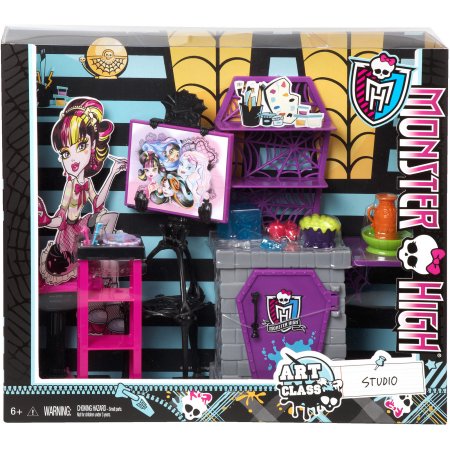 Big pieces: There is an easel, kiln, and other art supplies for painting, pottery, and ice carving. The black skeletal easel has a spinal column and three legs. The legs extend from the pelvis and are connected by a spiderweb. Skeletal hands hold the purple framed painting of Draculaura, Abbey Bominable, Robecca Steam, and Skelita Calaveras. A pink cart and chair accompany the easel. The cart is pink with three shelves, a black top with inset cup, and black wheels. Resting on the cart is a skullette palette, a brush, and a pen. The chair is a pink skeletal hand with webbed fingers forming the backrest. It rests upon a black column with a pink pedestal. The kiln is gray brick with a purple coffin-shaped door decorated with the Monster High crest and blue splatter. The top of the kiln has purple coffin-themed shelves with spiderweb backing. A purple wood shelf sits on the side of the kiln and is adorned with spiderweb accents.