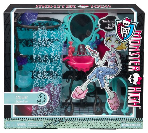 Big pieces: This playset includes a vanity, chair, and shower. Everything a ghoul needs to help make herself beautiful. The vanity has three black squirmy tentacle legs that hold a translucent blue shelf and a coral pink sink. The faucet and handles on the sink are silver seahorses. Above the sink is a mirror outlined by an aqua blue octopus. Hanging from two of the tentacles are translucent purple jellyfish accents. The chair has three legs made up of intertwined aqua blue tentacles. The seat is black coral with a pink Skullette emblem on the back. The stand-up shower has a coral pink seashell tub with a light blue doll stand and a black tentacle pipe. The pipe has a translucent blue basket, silver knobs, and a translucent purple jellyfish shower head. A round rod is at the top of the pipe and it holds a translucent blue curtain. The curtain is decorated with a print of seahorses and seashells.