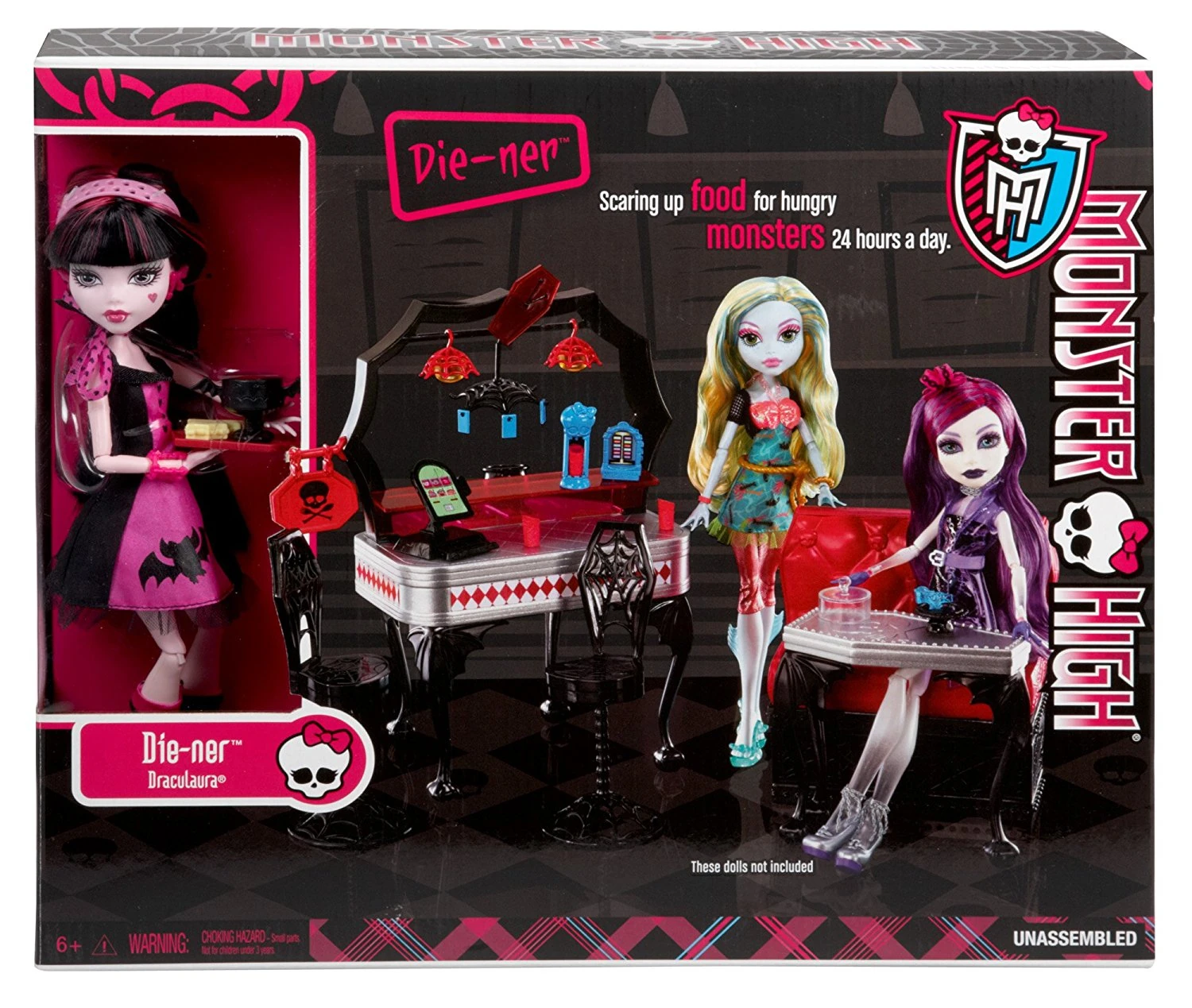 Notes: There are two versions of the Die-ner playset. The first release contains only a Draculaura doll, but the second both a Draculaura and an Operetta doll. The second release of the Die-ner is exclusive to Walmart.