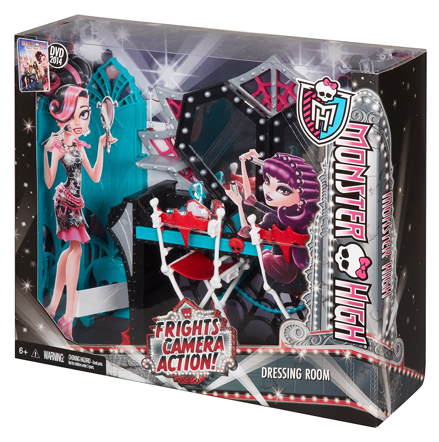 Big pieces: The Dressing Room playset includes a vanity, room divider, and two director’s chairs. The double vanity is black with a spider-embossed top, a spiderweb cutout back, and red and silver spiderweb accents. The front is turquoise with hanging strands and a red Skullette. Above the countertop is a double mirror framed in black with silver bulbs. Outlining the frame are studded silver embellishments with magenta webbing. The mirrors can be removed and used as a coffin-shaped compact. The room divider has three turquoise panels. The panels are decorated with Skullettes, wings, and web-like cutouts along the tops. The chair frames are white and made up of bones with hands on the armrests. The rest of the chairs are red and the backs are shaped like bats.