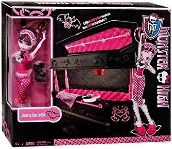 - The Jewelry Box Coffin is a black coffin with pink stylized heart, swirl, and skullette decorations and pink handles. Inside are a pink bow-shaped pillow with white lace, a blanket partially white with pink hearts and partially pink with black diagonal lines, and a white curtain with pink hearts. There's a white heart-shaped tray that can be slid onto the right side of the coffin and the inside of the lid features a pop-down TV set which displays the weather channel. On one side of the coffin's lid is a holder from which Count Fabulous can hang. The coffin's lid itself can open to reveal space to store jewels as well as the accesories that come with the playset.