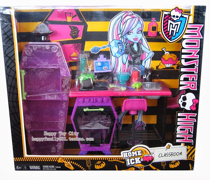 Big pieces: The purple refrigerator is coffin-shaped with four storage shelves. The clear door has a pale green bone handle and features etchings of the Monster High crest and spiderweb trim. The work station has a magenta counter top with black spiderweb burners, a black shelf, and a sink with a black dragon faucet. The counter top rests upon black legs and a purple oven. The oven has skullette-shaped knobs and a windowed black door with a pale green bone handle and spiderweb etchings. Two stools accompany the work station. The pink seats and tall black pedestals are decorated with spiderweb designs.