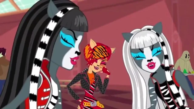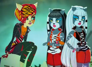 Nefera is soon reduced to her very last one, which summons a large Scargoyle behind the ghouls. However, Toralei and the Werecat Twins show up and scare it off when they bare their fangs. Toralei (speaking for herself and the twins) admits that as much as they want to win, they'd rather not do it through cheating. The ghouls finish their performance without anymore interruptions and ultimately win Monster Mashionals.