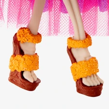 Accessories: She wears a burnt orange headband with molded floral accents. Fixed on the end of the headband is a beautiful teal flower with a skullette in the centre. Her belt matches her headband, repeating the same color and molded floral accents, while its flower buckle is a darker shade of orange. She wears pumpkin orange high heel sandal pumps. They have repeating zigzags along the soles and skulls molded into the heels. Decorating the straps of the shoes are teal floral accents like the one on her headband.