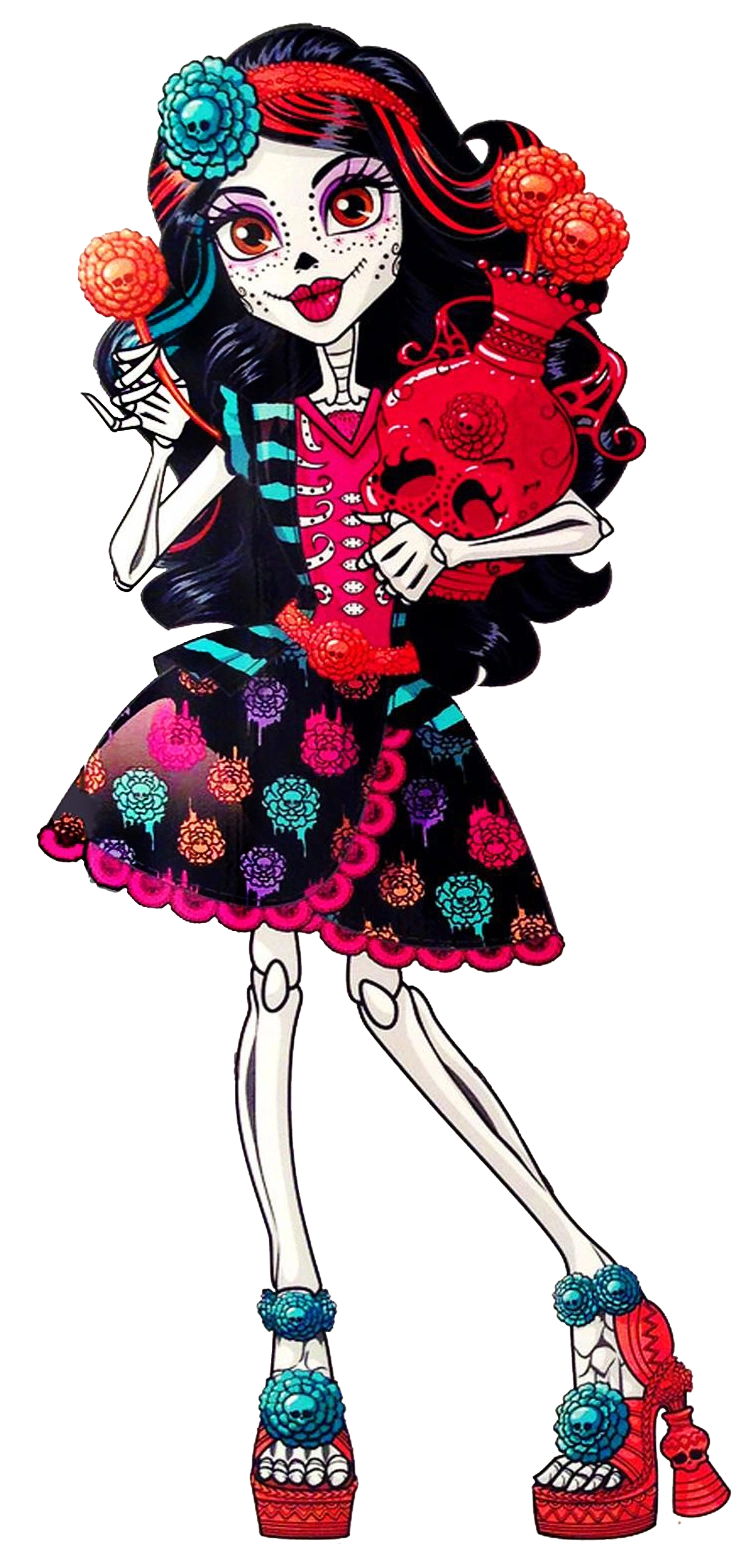 Clothes: Skelita wears a decorative ensemble with skeletal and floral designs to compliment her pottery project. She wears a teal vest-sweater over her dress with short flared sleeves and black stripes. The top of the dress is a lovely pink with a skeletal rib cage print, while the skirt is layered and black with a frilly pink lace trim. It has teal, pink, and orange flowers decorated across it with skullettes in them.