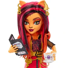 School is back in session, and the Monster High ghouls are showing up in scream-tastic style! Toralei Stripe doll struts down the Monster High hallways in a clawsome fashion featuring a plaid skirt with claw-mark details, t-shirt with a creepy-cute cat graphic and cropped moto jacket. Her gore-geous, werecat-inspired look is complete with a chain belt, choker necklace and white combat boots. Toralei Stripe doll comes with a 'Hissfits' t-shirt and her pet saber-tooth tiger, Sweet Fangs, plus spooktacular storytelling accessories, like a metallic 'Hissfits' backpack, milk and kitty food and a smartphone.