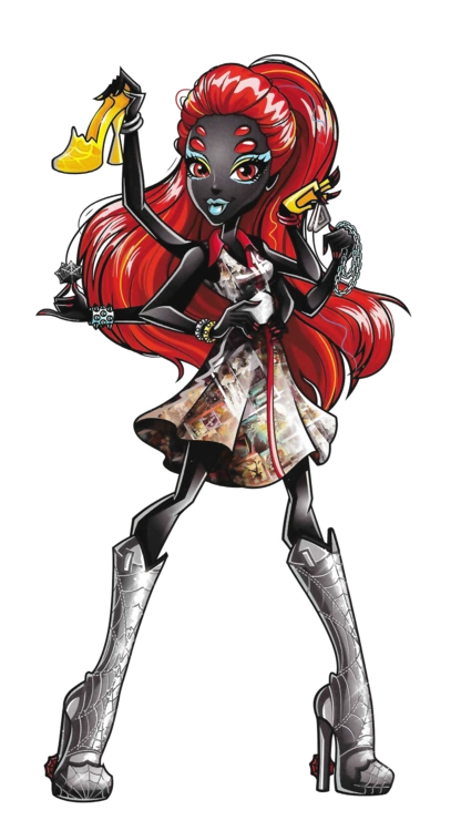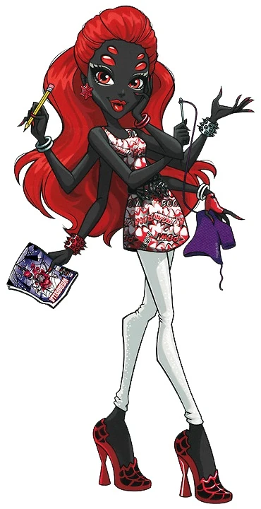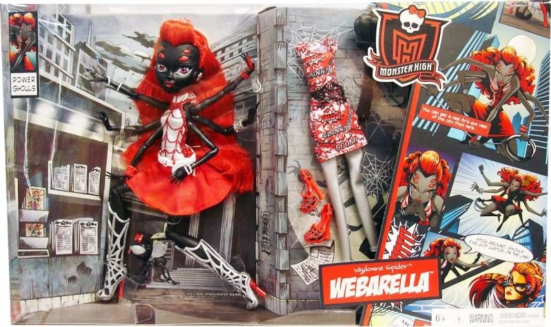 - Wydowna is portrayed as a Power Ghoul by the name of Webarella, and wears a glittery white halter neck top with red spiderweb designs, paired with a plain red skirt. Her skirt is fastened by a simple white belt with her Skullette at the front. Her boots are silver with holes, shaped like a spiderweb. The boots are studded, while the heels are red. She accessorises with six assorted bracelets, one on each arm: She has black and silver bangles and a red studded bracelet on her right hands, while she has red and white bangles and a silver studded bracelet on her left hands. She wears a red, fingerless glove on her highest left hand, and has a silver, double-stranded chain (likely a whip) on her belt. Her earrings are red, star-shaped spiderwebs. Her makeup consists of monochromatic silver eyeshadow, and cherry red lipstick with her black fangs showing. The fringe of her hair is rolled backwards to reveal a widow's peak, and the rest of her red hair is elaborately coiffed.