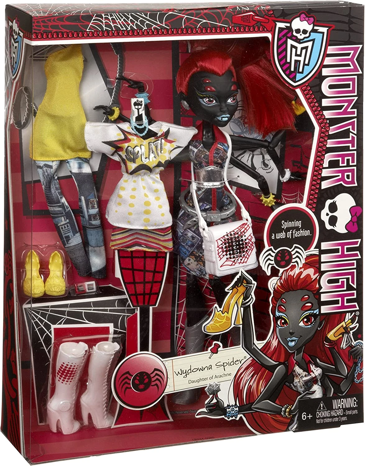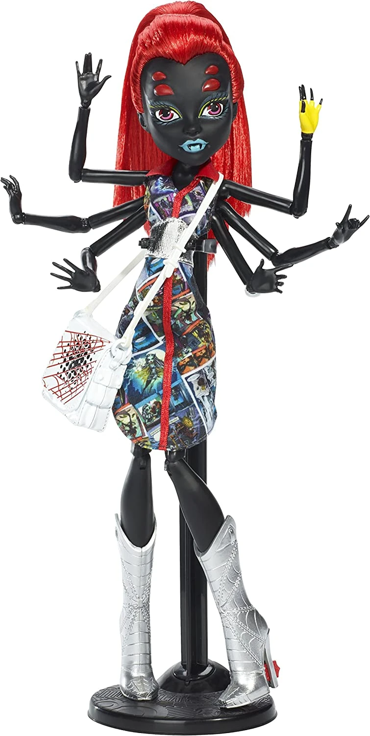 She comes with an extra outfit, which consists of a white, sleeveless sheath dress with a graphic design of red, black, and silver explosions and comic book sound effect phrases; a pair of shimmery silver long pants; a black spiderweb belt; and a pair of black pumps with red spiderweb patterns. Her pet is a black fly with white eyes, translucent white wings, a red bow, and a red mouth.