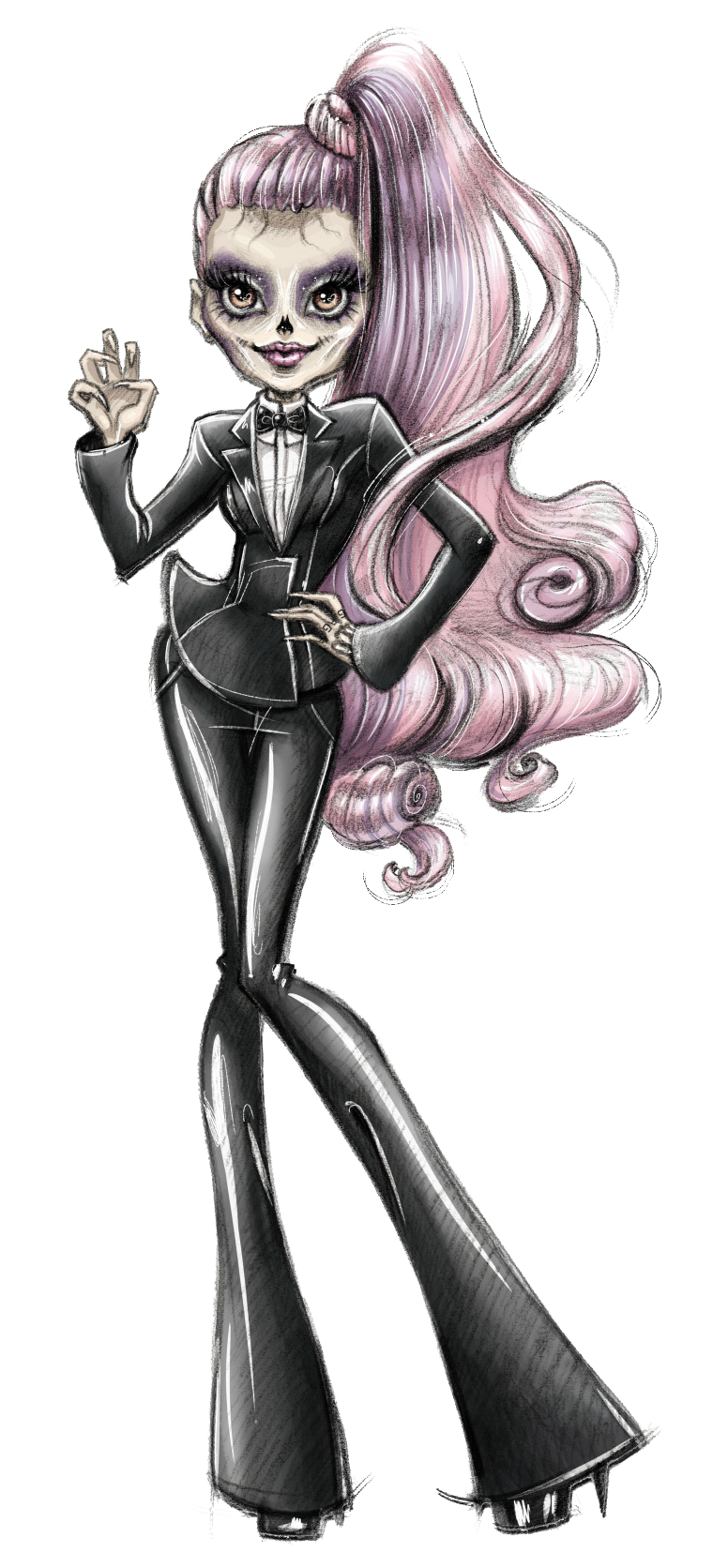 Zomby Gaga is a ghoul who loves to celebrate bravery, kindness, and acceptance! Monsters worldwide are drawn to her welcoming personality, clawesome talent, and fangtastic sense of style, which changes with her mood. Her fave outfit is a sleek black tux that makes her feel elegant and sophisticated while still rocking her tattoos and scary-cool accessories; however, she believes every monster should wear what makes them feel most like themselves. Zomby Gaga is on a mission to spread love throughout the world and invites every monster to join her.