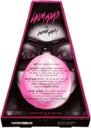 Zomby Gaga has a face resembling a skull with brown eyes and dark areas all over her face and veins running down from the top of her head. She is blowing a bubblegum bubble out of her mouth. She has pastel pink and grey/purple hair wrapped up in a side ponytail. She wears a black tuxedo, complete with a black bow tie, and wears a pair of black platform heels. She has tattoos on her hands of bones and the words "LADY GAGA" spelled out on her knuckles and spider webs on her thumbs. She also has a spine tattoo on her neck. She comes with an alternate outfit, consisting of a red plaid dress with the Lady Gaga logo all over it and black fishnet tights.